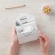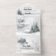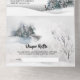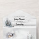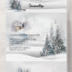 A beautiful watercolor design featuring soft white snow enveloping fir trees and a winter log cabin. A single snowman appears on the top third; a white snow owl in the middle and a snow fox on the bottom. The outside is bathed in winter ice colors and has a grove of fir trees across which soft snow is falling. These are ideal for winter baby shower celebrations.