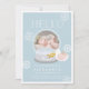 This cute boy's photo birth announcement features a baby blue background with a snow globe, snowflakes, and white dove. The reverse side features a light gray background with white snow patterns. Personalize for your needs. You can find more matching products at my store.