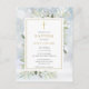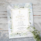 Featuring delicate watercolor greenery leaves on a winter frost background and an elegant gold crucifix, this chic gender neutral baptism or christening invitation can be personalized with your special information, with a silver sage background on the reverse. Designed by Thisisnotme©