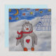 You will smile to see this cute and cuddly penguin come out of his igloo at the North Pole to say hello. He is painted in soft pastel gray with a vibrant orange nose and feet. The little penguin wears a cozy red scarf and has a bright red heart on his tummy. The frosty night sky is full of orange and yellow stars and a crescent moon hangs low.