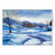 Painting of a iced over road in winter with snow all around and a red barn in the distance.