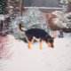 Winter snow scene with cute black and tan dog hip flask