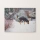 Winter snow scene with cute black and tan dog jigsaw puzzle
