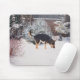 Winter snow scene with cute black and tan dog mouse pad