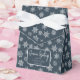 Navy blue favor box with ribbon bow and simple holiday greeting tag. Box is emblazoned with white and gray snowflakes of varying sizes. Perfect for party take-aways, host gifts, baked goods, and more. Design is available in a curated collection of modern holiday colors. Contact us for any customizations. Happy holidays!