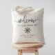 Welcome guests to your winter wedding with these chic and modern personalized tote bags. Design features "welcome to our wedding" in a modern mix of handwritten calligraphy script and block lettering, with space to personalize with your names and date. A black snowflake silhouette illustration completes the design. Perfect for wedding favors or hotel welcome bags for Christmas season or winter weddings!