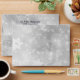 Festive winter / holiday invitation and greeting card envelope, with a white and silvery sparkling look, with white snowflakes, on the outside and a solid navy blue, on the inside. Personalize the blue return address, on the back flap, to suit your needs.