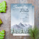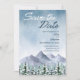 Winter wedding design featuring watercolor background depicting a snowy mountain landscape and pine trees in shades of blue and gray. The text can easily be personalized for a unique one of a kind design for your special day.A chic choice for elegant winter weddings in mountain or forest