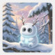 cute, fluffy white snow creature with large, dark eyes and tiny twig antlers. It is sitting on a snow-covered branch in a whimsical winter forest, with snow-covered pine trees and a pastel-colored sunset sky in the background. The creature is slightly glowing, and snowflakes are falling around it.