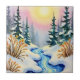 Pretty stream flowing among the snow on a winter day with a beautiful sunrise. Pine trees can be seen in the background.