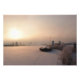 Photo print of a sunrise over a frozen canal with snow and a boat with some windmills in winter at Kinderdijk in the Netherlands.