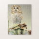 Test your jigsaw puzzle skills with this winter owl on post fine art jigsaw puzzle. Jigsaw reproduced from original watercolor fine art painting by Sarah Trett.