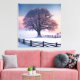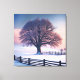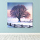 Winter tree and fence in a snowy field with sunrise pink and blue sky