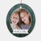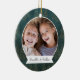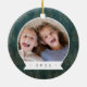 A beautiful double sided Christmas photo ornament displaying a favorite photo on each side in a round layout, on a dark teal watercolor background dotted with pine trees. Personalize with a custom caption on the front in handwritten lettering, and add the year to the back.