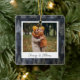 A beautiful double sided Christmas photo ornament displaying a favorite photo on each side, on a navy blue watercolor background dotted with pine trees. Personalize with a custom caption on the front in handwritten lettering, and add the year to the back.