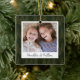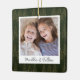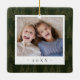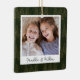 A beautiful double sided Christmas photo ornament displaying a favorite photo on each side, on a dark hunter green watercolor background dotted with pine trees. Personalize with a custom caption on the front in handwritten lettering, and add the year to the back.