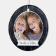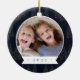 A beautiful double sided Christmas photo ornament displaying a favorite photo on each side in a round layout, on a midnight blue watercolor background dotted with pine trees. Personalize with a custom caption on the front in handwritten lettering, and add the year to the back.