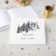Winter wedding guest book featuring pine trees, mountains, and snow scene with a light watercolor splash on the back of the book. The colors are in shades of gray, green, and blue. Easy to personalize with your own information.