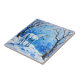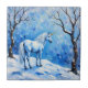 A dreamlike scene captures a unicorn in a moment of quiet contemplation amidst a gentle snowfall. The primary colors are cool blues, icy whites, and whispers of silver. The unicorn, with its flowing mane and tail, is depicted with slightly stronger pigment to stand out, while the falling snow is created with tiny, delicate white spatter marks and lighter washes. The ground is a blend of snowy white and faint blue shadows, with bare tree branches appearing as soft, blurred lines in the background, adding to the tranquil and ethereal mood. The overall effect is delicate and almost crystalline, perfect for a calming interior space.