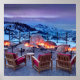 A Nice Cozy scene of a fire pit and chairs on a snowy mountain with a view of more beautiful snowy mountain.