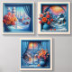 Bring the cozy charm of a winter village into your home with these stunning art pieces. Through handcrafted windows, witness snow-covered landscapes bathed in the warm glow of sunset. A vibrant vase of flowers defies the cold, reminding us of the enduring beauty and enduring hope of the season.