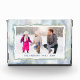 This photo box features horizontal photo frame on a soft watercolor background in blue, green, purple and gold. The photo frame is bordered by a wavy hand drawn border. Custom text allows you to add a name and year for a perfect keepsake Christmas gift.