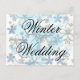 A beautiful winter wedding invitation card featuring snowflakes in blue white and silver.