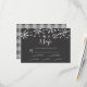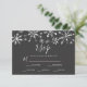 Winter theme wedding rsvp card with silver glitter snowflakes. On the top it says "rsvp" in modern calligraphy. It also states when to respond by, section for the guests to write their name on, checking off accept or regret, and meal options. All texts are editable. Silver and charcoal grey. The back of the card is grey plaid.