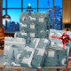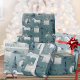 A holiday gift wrapping paper featuring a winter white wild horse with navy blue spruce trees, navy berries, white ball ornaments and wrapped white gift boxes make this exceptional holiday themed patterned gift wrap.