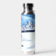 A waterbottle with a beautiful winter scene including snowy mountains, rustic cabin and snow covered evergreens. You have the option to revise or delete the text. Original artwork by W.B.