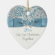 Remember your special day with this beautiful heart shaped ceramic glittery blue, silver gray and white snowflakes first Christmas "Happily Ever After" keepsake ornament. It has a PRINTED ice blue ribbon and bow with a pair of diamond jewels and FAUX blue glitter joined hearts on it. You can customize the text to say whatever you want. ****PLEASE be sure your text is placed where you want it, as it will print out as it appears on your monitor. Zazzle will NOT correct anything. If you need any assistance, please email niteowlstudio@gmail.com.
