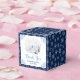 This cute and whimsical watercolor baby shower favor box features a watercolor winter wonderland scene with adorable arctic animals, such as a polar bear, penguin, cat, whale, seal and a moose. In the background are snow capped mountains, ice caps and trees. The text combines handwritten script and sans serif fonts for a stylish and modern look. Falling snowflakes and beautiful blue floral arrangements give a winter feel. This is perfect for winter and Christmas baby showers.