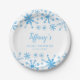 Elegant winter wonderland theme baby shower paper plate featuring blue watercolor snowflakes. Customize this product by adding the mother-to-be's name and event date. Beautiful design for baby boys.