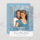 Set the tone for your Christmas or winter wedding with this inexpensive, yet luxuriously elegant ice blue, silver gray floral FAUX glitter damask pattern PHOTO wedding save the date card that has a background of assorted white snowflakes on it and a PRINTED steel blue ribbon and bow with a pair of diamond jewels and FAUX blue glitter joined hearts on it that matches the winter wedding invitations shown below. It would be perfect for a winter wonderland theme or for a Christmas or New Year's Eve wedding. ***PLEASE NOTE there are no raised elements on this invitation. Everything is printed flat. ***PLEASE NOTE that if you change the fonts or size of the fonts, it may alter how your card prints. It will print the way you see it on your monitor, so if you have alignment issues, or sizing problems, please contact me for help BEFORE you order. I will not see your invitation once you order it and Zazzle will NOT edit anything (typos, alignment, etc.). If you require assistance or would like any other matching items, or a different color combination, please email your request to niteowlstudio@gmail.com.
