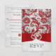 Set the tone for your Christmas or winter wedding with this inexpensive, yet luxuriously elegant red and silver gray floral FAUX glitter damask pattern wedding RSVP card that has a background of assorted white snowflakes on it and a PRINTED red ribbon and bow with a pair of diamond jewels and FAUX red glitter joined hearts on it. It would be perfect for a winter wonderland theme or for a Christmas or New Year's Eve wedding with a red and silver color scheme. It has fun mad-lib responses that ask your guests to reply that they'll be there with bells on, will be there with no bells on, will be there...undecided on the bells, or with their regrets that say they will not be there, as they heard there would be people wearing bells, or they will not be t here, regardless of the bell controversy. What better time to use this funny RSVP card than with your winter or Christmas wedding? People may actually show up with bells on! ***PLEASE NOTE there are no raised elements on this invitation. Everything is printed flat. ***PLEASE NOTE that if you change the fonts or size of the fonts, it may alter how your invitation prints. It will print the way you see it on your monitor, so if you have alignment issues, or sizing problems, please contact me for help BEFORE you order. I will not see your invitation once you order it, and Zazzle will NOT edit anything (typos, alignment, etc.). If you require assistance or would like any other matching items, or a different color combination, please email your request to niteowlstudio@gmail.com.