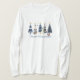 This sweet shirt is primarily blue and gold. There's a row of Christmas trees that are all decorated differently. A snowman stands in front, dressed in a top hat and scarf to stay warm. There is an adorable bunny rabbit and squirrel checking out the snowman. Snowflakes are falling everywhere. Below it says Winter Wonderland in a pretty script.