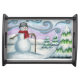 This serving tray shows a colored pencil drawing of a winter scene with a happy snowman, snow covered trees, and magic in the air.