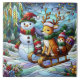 A cheerful snowman, a reindeer, and a fox enjoy a snowy landscape while riding a sled filled with colorful presents under a magical winter sky.