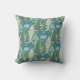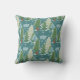 A colorful winter woods with red fox patterned throw pillow with a pretty teal blue sky, snowflakes, clouds, evergreen trees covered with snow, and little red foxes!