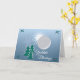 Beautiful winter illustration greeting card with evergreen trees coated in snow, holly leaves, the winter sun and moon and a snowflake on a blue background. Customizable text reads "Yuletide Blessings" - change as desired. Inside you can include a personalized message.