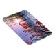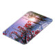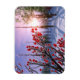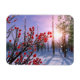 Bright red berries covered in sparkling ice against the backdrop of a glowing winter sunset behind bare trees and dark pines.