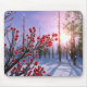 Bright red berries covered in sparkling ice against the backdrop of a glowing winter sunset behind bare trees and dark pines.