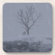 A cold and windy 3D landscape in winter, created in Vue. On top of a hill white with ice and snow, against a stormy grey sky with rain or sleet falling steadily, a lone, bare maple tree stands with a wooden bench under it.