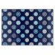 A glass cutting board, perfect for the winter season, with a polka dot pattern of snowflakes, rings, swirls, stars, and spots.