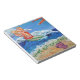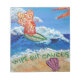 The painting shows a glimmering orange surfing angel on a blue ocean with a sparkling sun. Sea foam washes up on the sand surrounding the words "Wipe Out Cancer". There is a pink sea shell on the beach. The painting was rendered in acrylic and sprinkled with glitter for texture and shine. Personalize this cancer angel notepad with your own text and images using the customize it option.