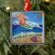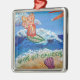 The painting shows a glimmering orange surfing angel on a blue ocean with a sparkling sun. Sea foam washes up on the sand surrounding the words "Wipe Out Cancer". There is a pink sea shell on the beach. The painting was rendered in acrylic and sprinkled with glitter for texture and shine. Personalized this ornament using the "Customize It" button.