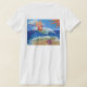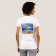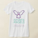 The front of the shirt has the DonnaBellas Angels logo. The back features the Wipe Out Cancer Angel. painting shows a glimmering orange surfing angel on a blue ocean with a sparkling sun. Sea foam washes up on the sand surrounding the words "Wipe Out Cancer". There is a pink sea shell on the beach. The painting was rendered in acrylic and sprinkled with glitter for texture and shine.