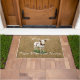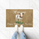 Welcome, Please Wipe Your Hooves text with a cow on a rustic burlap background.