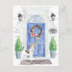 Announce your new address with our stylish announcement featuring a Wire Haired Fox Terrier, blue front door, welcome mat, slate sign, topiaries and a floral wreath set on a gray brick background.