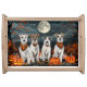 Unleash the spooky spirit with this eerie Halloween design featuring a pack of dogs under a dark, moonlit sky, surrounded by flying bats and glowing pumpkins. Perfect for those who love a touch of frightful fun with their furry friends!